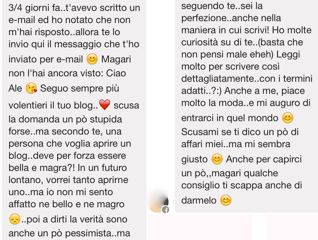 Ehi ciao!!! … innanzitutto grazie per tutti i complimenti 😉 … allora, cercando di rispondere con ordine alle tue domande … Una persona che vuole aprire un blog deve essere per forza bella e magra? Assolutamente NO! … sicuramente l’apparenza e l’aspetto fisico sono importanti, anzi forse la prima cosa, è inutile girarci tanto intorno … però (c’è sempre un però), non sono così fondamentali e soprattutto non bastano!!! … di certo una persona bella fisicamente attira, e dato che anche l’occhio vuole la sua parte è piacevole da vedere/seguire … ma a mio parere dopo un po’ se non è in grado di trasmettere altro stufa e in un certo senso perde anche la sua bellezza iniziale, ovvero l’unico motivo che ci aveva portato a seguirla… Quindi se tu dici di non sentirti nè bello nè magro (forse anche perchè come hai aggiunto sei un po’ pessimista) se posso darti un consiglio non dovresti deprimerti e scoraggiarti ma anzi, se pensi di avere “altro” da mostrare, trasmettere e condividere “fallo!!”, e vedrai che potresti essere molto apprezzato per tante altre tue qualità!!! 🙂 … Riguardo alle altre curiosità che avevi nei miei confronti … beh mi fa piacere che ti piaccia il modo in cui scrivo … si, piace anche a me! ahah … nel senso che odio le cose troppe impostate, perfettine, che alla fine sembrano quasi finte o scritte da una macchina … ecco a me piace scrivere così, in modo spontaneo e quasi “parlato”, proprio come se stessi parlando al telefono!! ahah … per il resto ti dirò che non leggo molto per scrivere così “dettagliatamente”, o meglio, leggo tanto ma non chissà che libri (son già bastati e avanzati quelli del liceo e dell’università!!! ahah) … Per concludere ribadisco, il mio consiglio è di fare quello che ti senti e seguire il tuo istinto … se ti va di provare a fare qualcosa nell’ambito della moda che ti piace tanto, “provaci” … io sono sempre dell’idea che “tentar non nuoce” e che nella vita bisogna avere meno rimpianti possibili, quindi meglio provare e magari fallire ma almeno avere la soddisfazione personale di averci provato piuttosto che non provarci nemmeno e vivere col dubbio di “chissà come sarebbe andata se…” … che è una cosa terribile!!! … P.S: in bocca al lupo!!! 😉