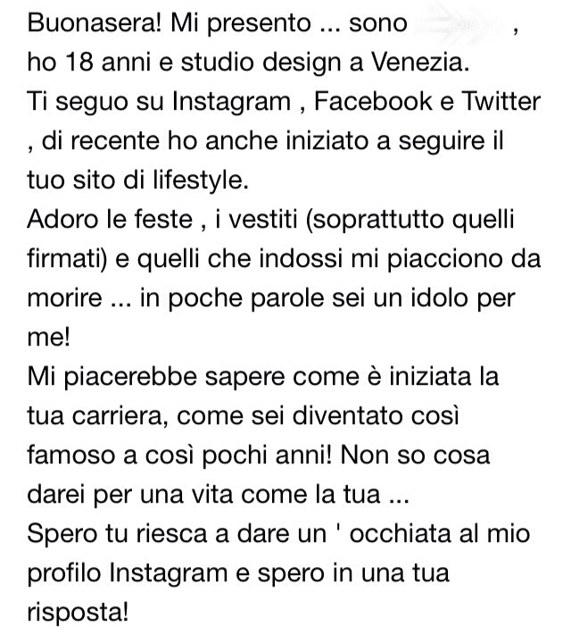 Ciao!! Grazie mille, sono contento che ti piaccia il mio blog!! 🙂 … Consigli su come “diventare” lifestyle blogger, come avere collaborazioni con le aziende e come avere un profilo di successo su instagram? … bene … la prima regola è che non ci sono regole!! (stile regole del “fight club” ahah) … nel mio caso, ad esempio, penso sia nato tutto dal seguito di amici/amici di amici/conoscenti e sconosciuti su Facebook e dai followers su Instagram … Ogni tanto anche io mi chiedo come/da dove nasca tutto questo seguito (che per carità non è nemmeno niente di stratosferico ma per non essere nessuno sono consapevole di essere seguito da tantissime persone) la risposta penso sia una sola: evidentemente piaccio abbastanza sia fisicamente sia per quello che faccio e che condivido della mia vita … probabilmente è proprio questo mix di cose che alimenta il mio “successo” sui social come dicevi … quindi non c’è nessun trucco, anzi, forse il segreto è proprio quello di essere sè stessi e se piace quello che sei e quello che fai il seguito arriverà in automatico… Le collaborazioni con le aziende, almeno nel mio caso, sono arrivate quasi sempre a partire da instagram dato che in qualche modo saranno arrivate al mio profilo … un consiglio che posso darti è quello di inserire il tuo indirizzo e-mail all’interno della descrizione sul tuo profilo, così che se qualcuno dovesse essere interessato può contattarti in modo più diretto e serio piuttosto che attraverso dei semplici commenti sotto alle tue foto! 😉