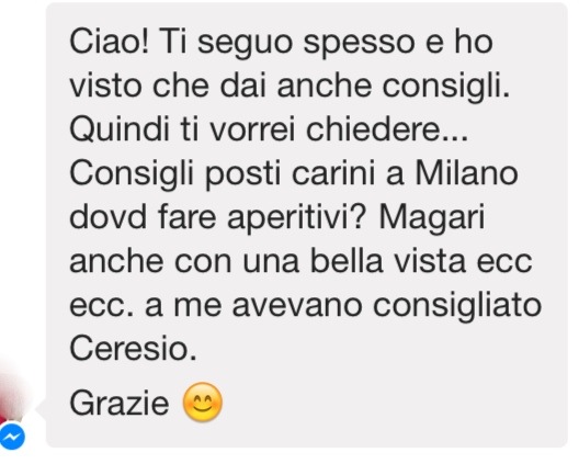 Ciao!!! Certo, sono qui (anche) per questo! ahah … allora posti carini dove fare aperitivi a Milano … dipende innanzitutto se vuoi un posto carino (come location) ma dove oltre al drink mangi due arachidi e patatine se ti va bene, oppure posti dove ci sono buffet pazzeschi e hai solo l’imbarazzo della scelta su cosa mangiare! (io preferisco decisamente questi ultimi) … Comunque così su due piedi i primi posti carini che mi vengono in mente e che ti consiglio sono: Fiat Executive Lounge, Radetzky Cafè, Atm Bar e Ceresio 7 (zona Garibaldi / Moscova); Frank (Porta Venezia); Yguana (Colonne); Royalto (Arco della Pace); Manhattan (Navigli) … Penso di aver coperto un po’ tutte le zone quindi adesso avrai solo l’imbarazzo della scelta!!! 😀