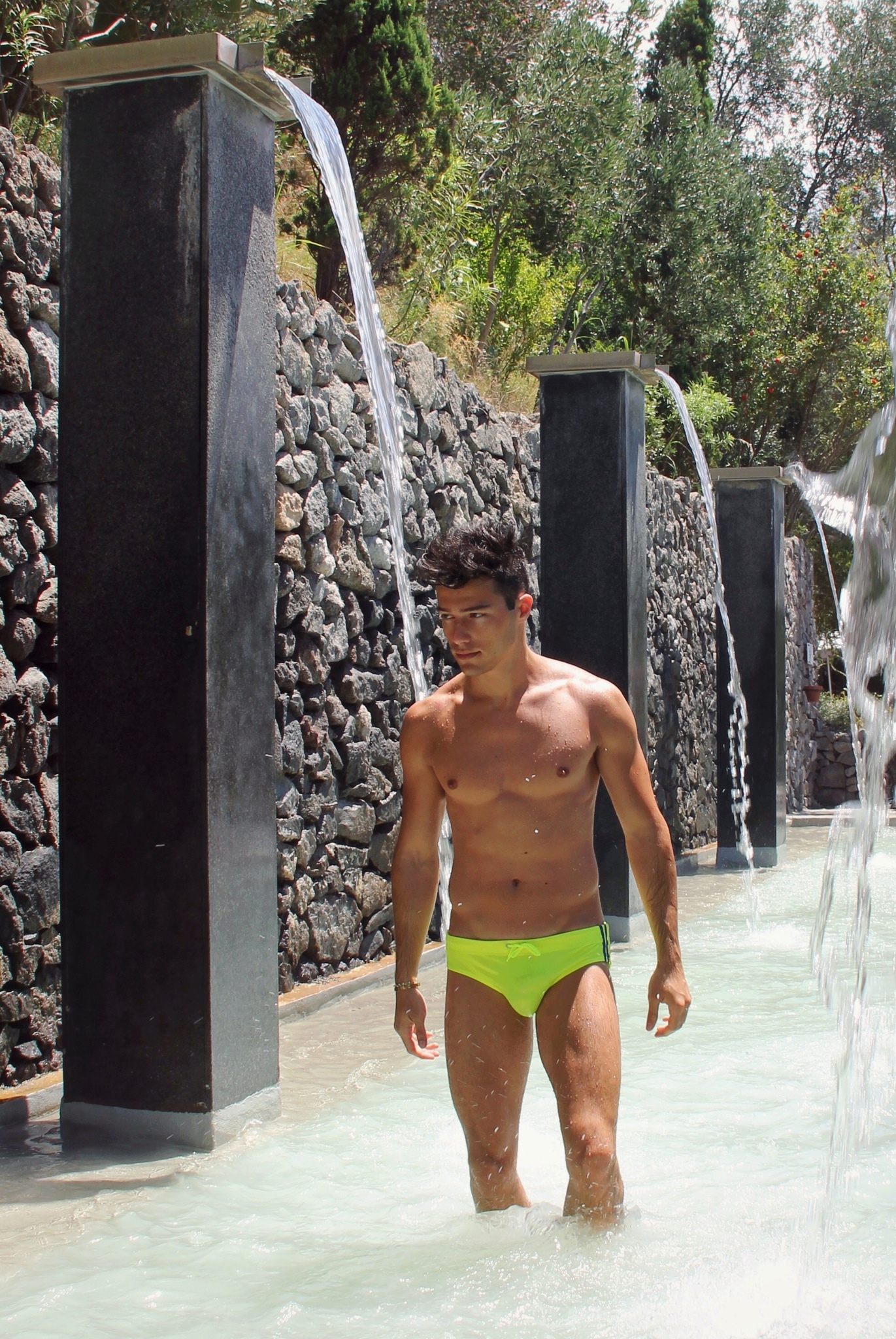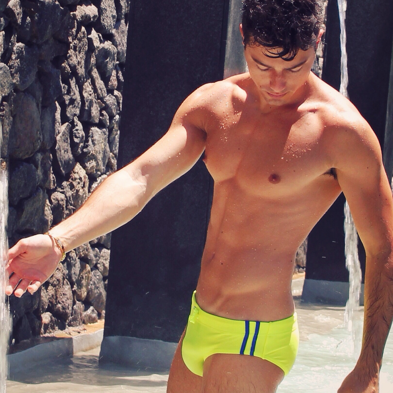 Ho approfittato della mia ultima vacanza appena trascorsa ad Ischia per indossare questo costume da bagno del nuovo brand Black Code, modello slip, colore giallo e con due particolari strisce blu sul fianco destro.