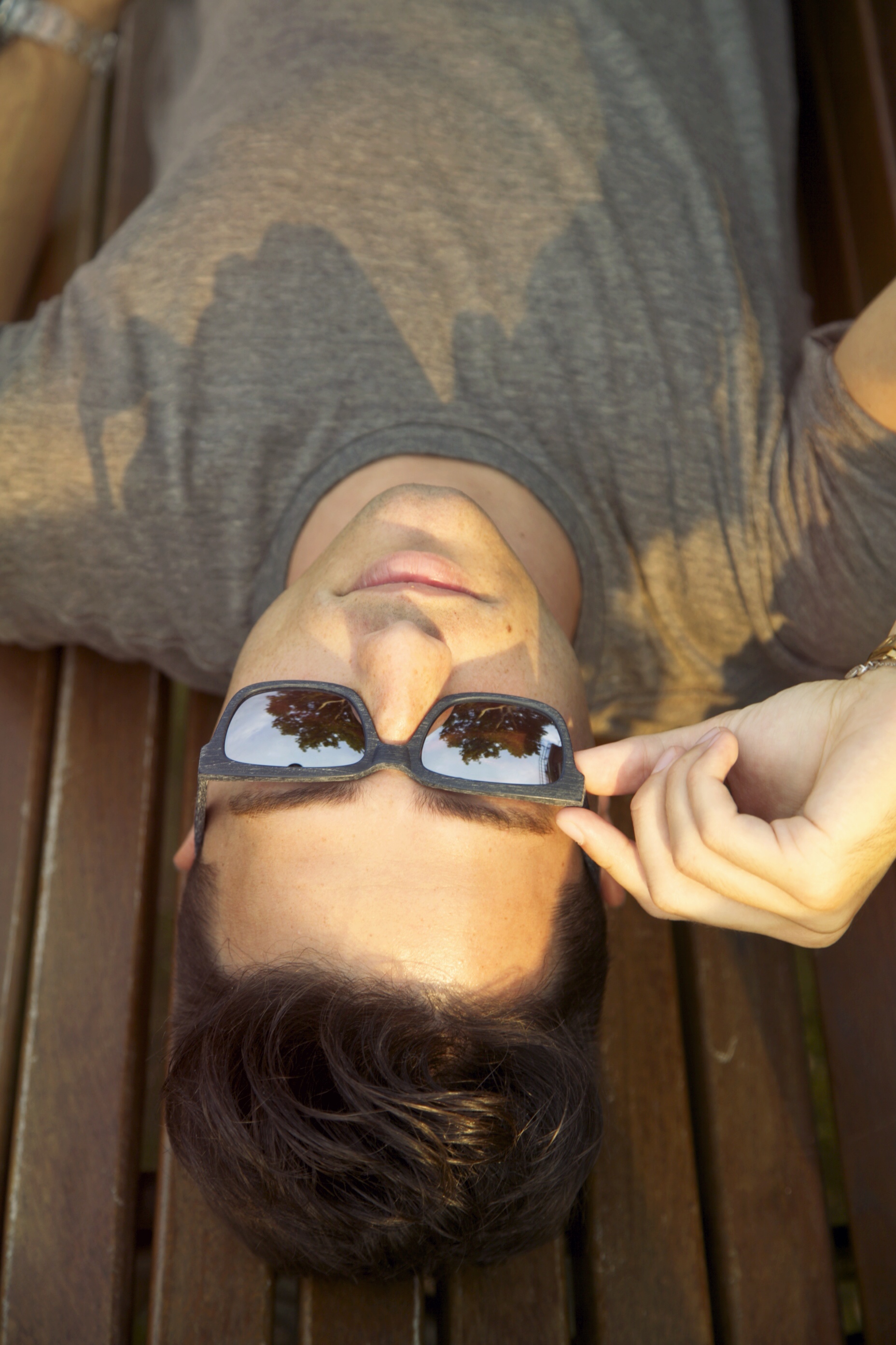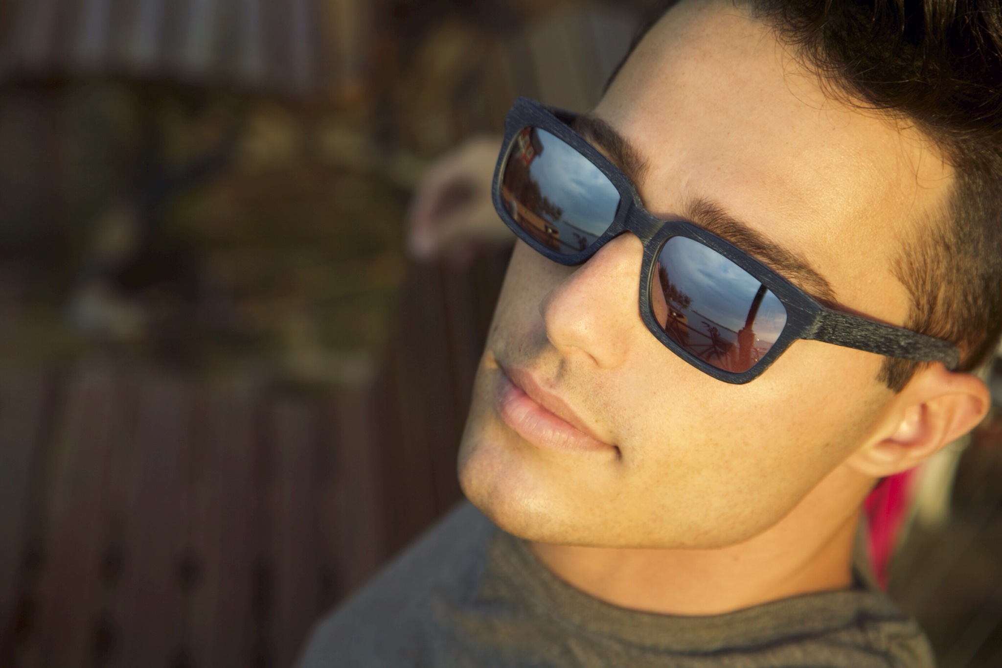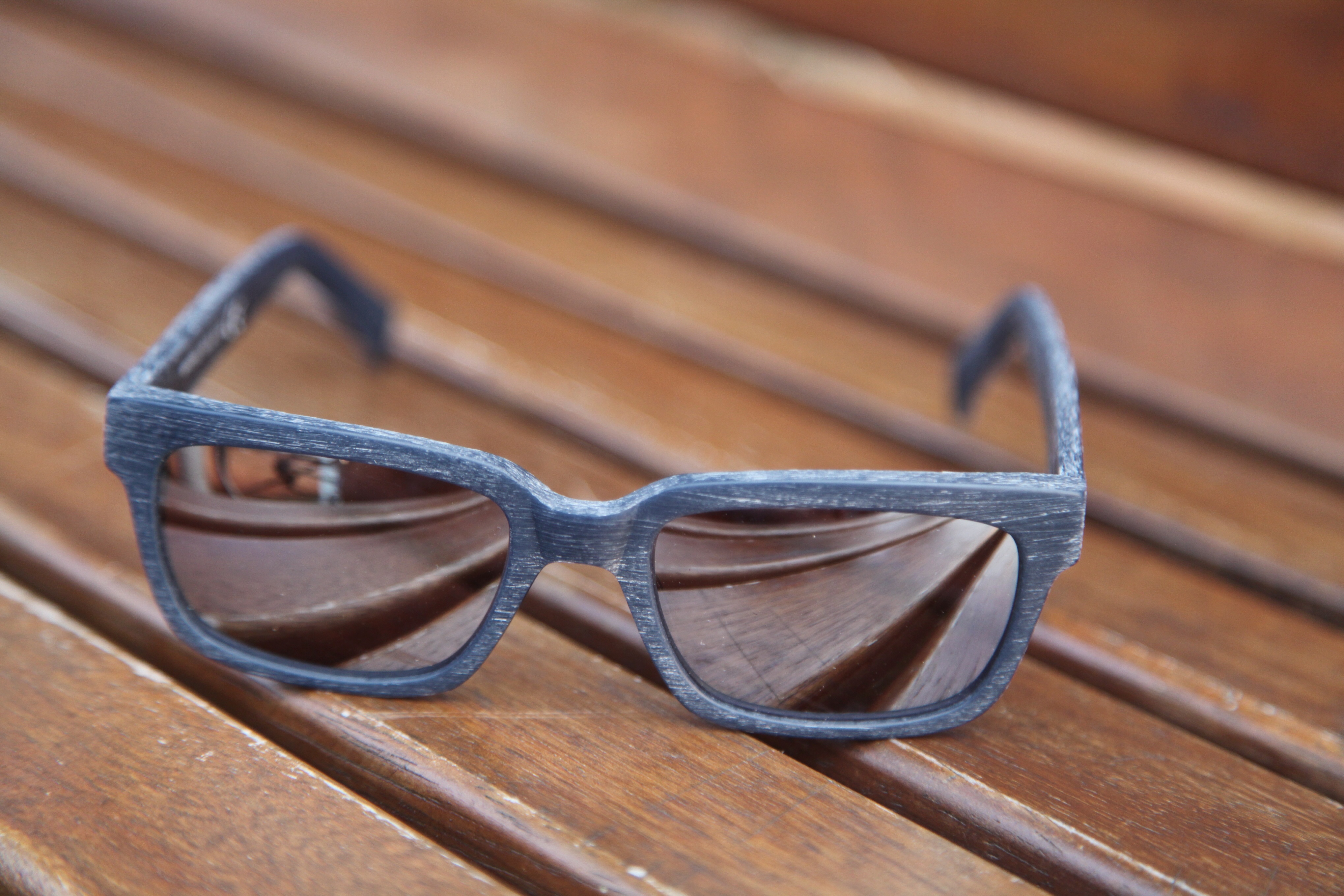 Di questa prima collezione, sia per uomo che donna, lanciata per la Primavera/Estate 2014, ho scelto di indossare il modello “Imposing”, che mi ha subito colpito per la particolarità ed eleganza dovuta all’effetto “legno” del materiale utilizzato per la montatura, insieme al contrasto dei colori blu e grigio delle lenti specchiate.