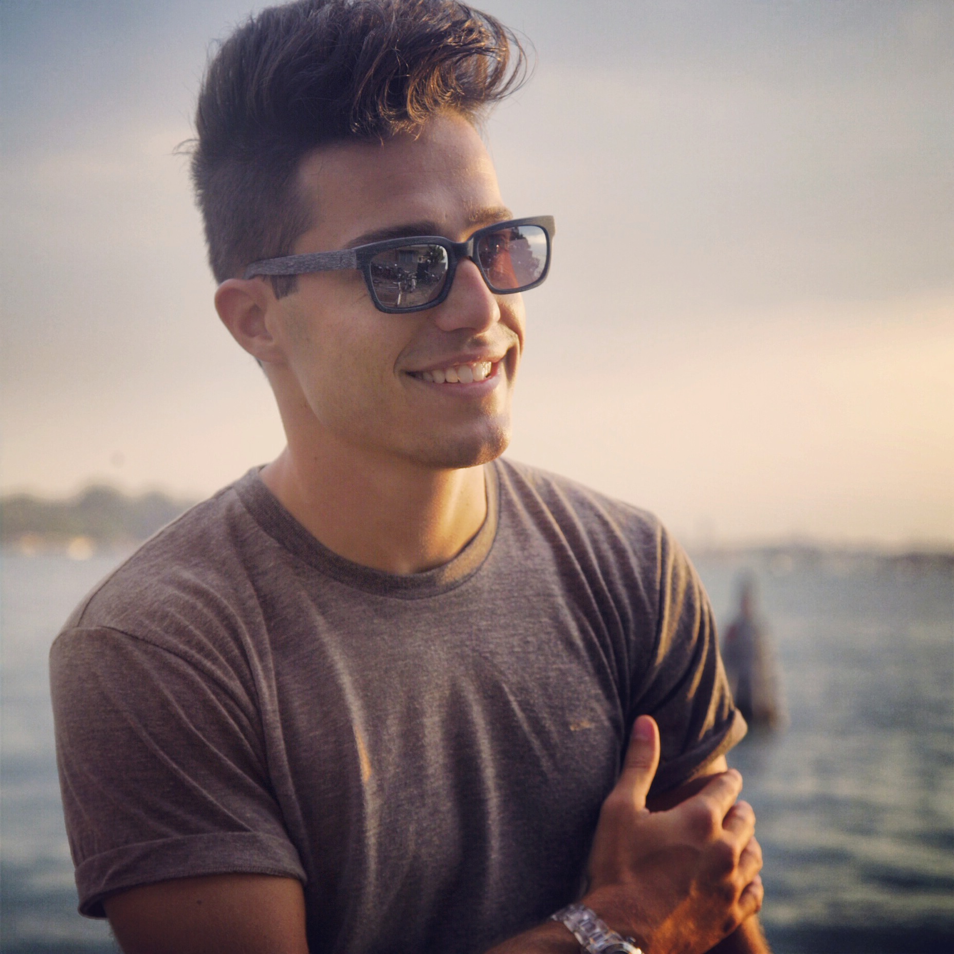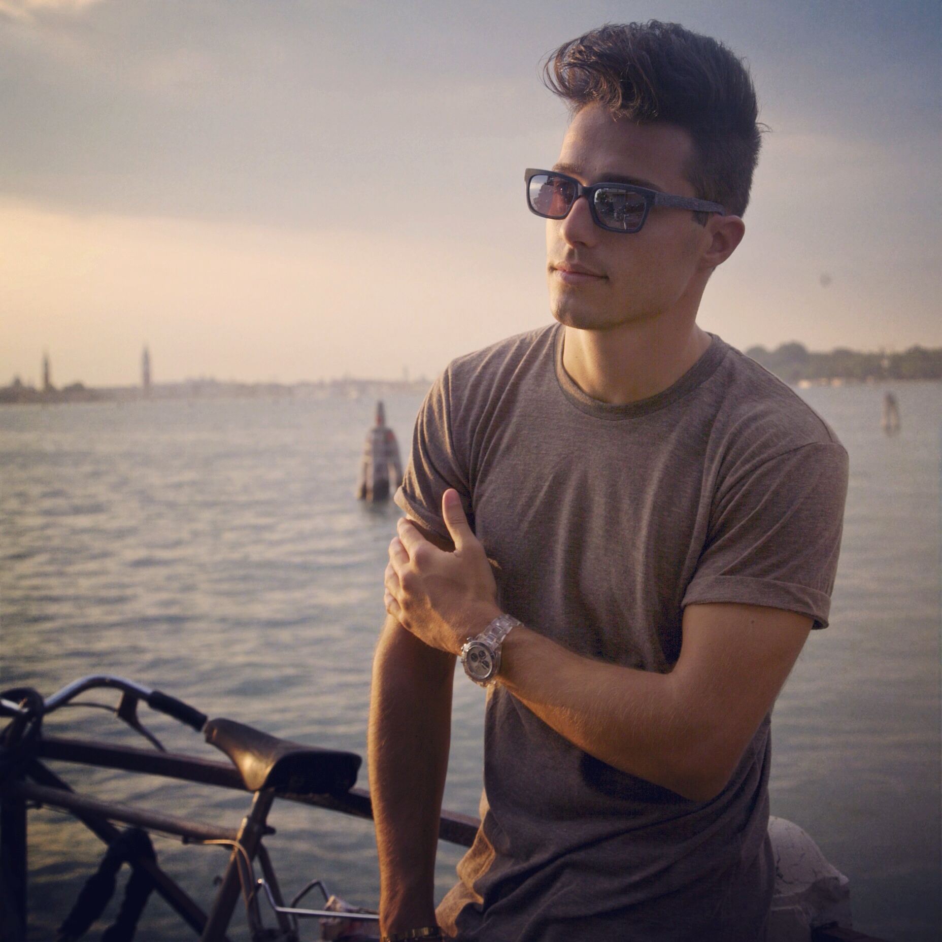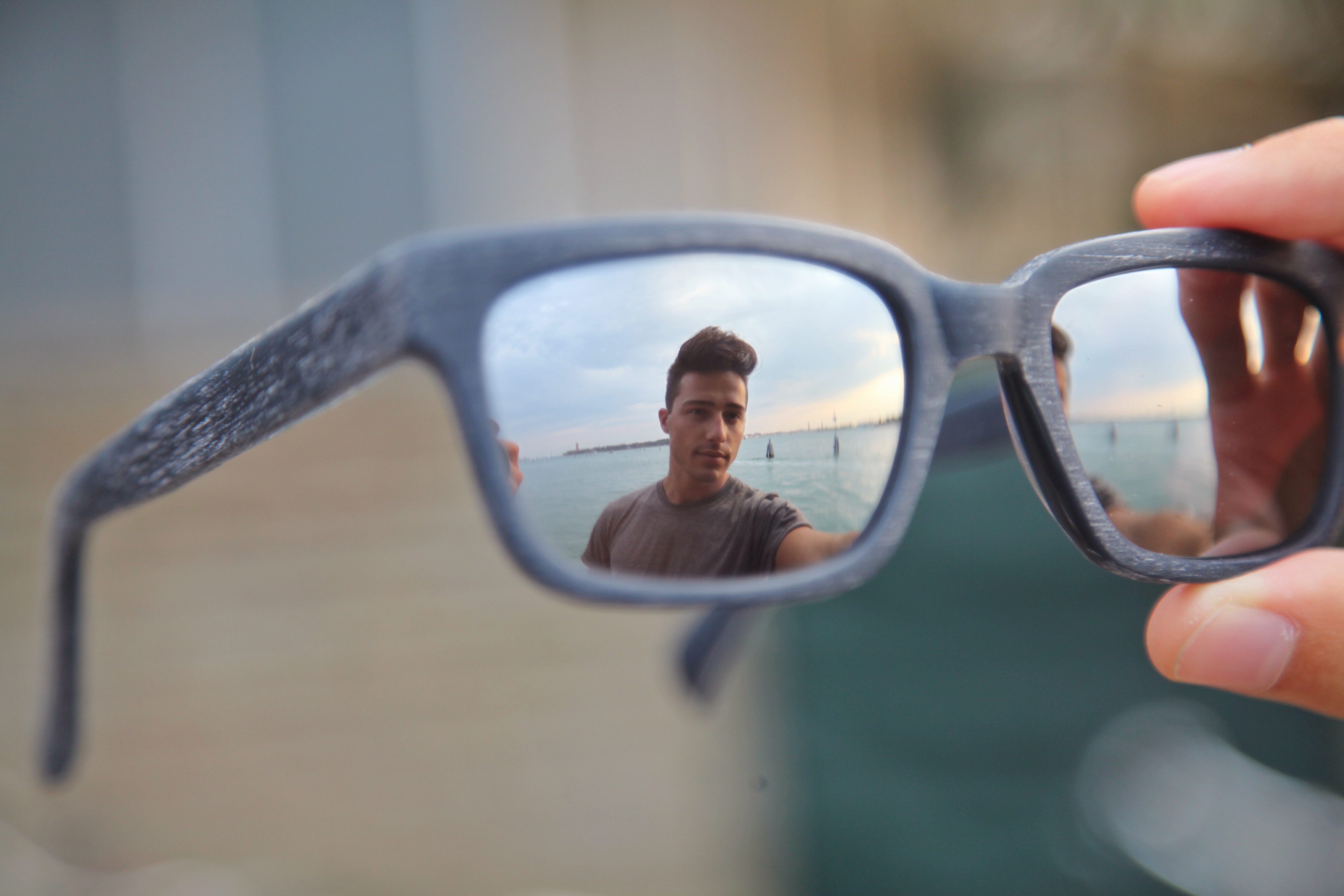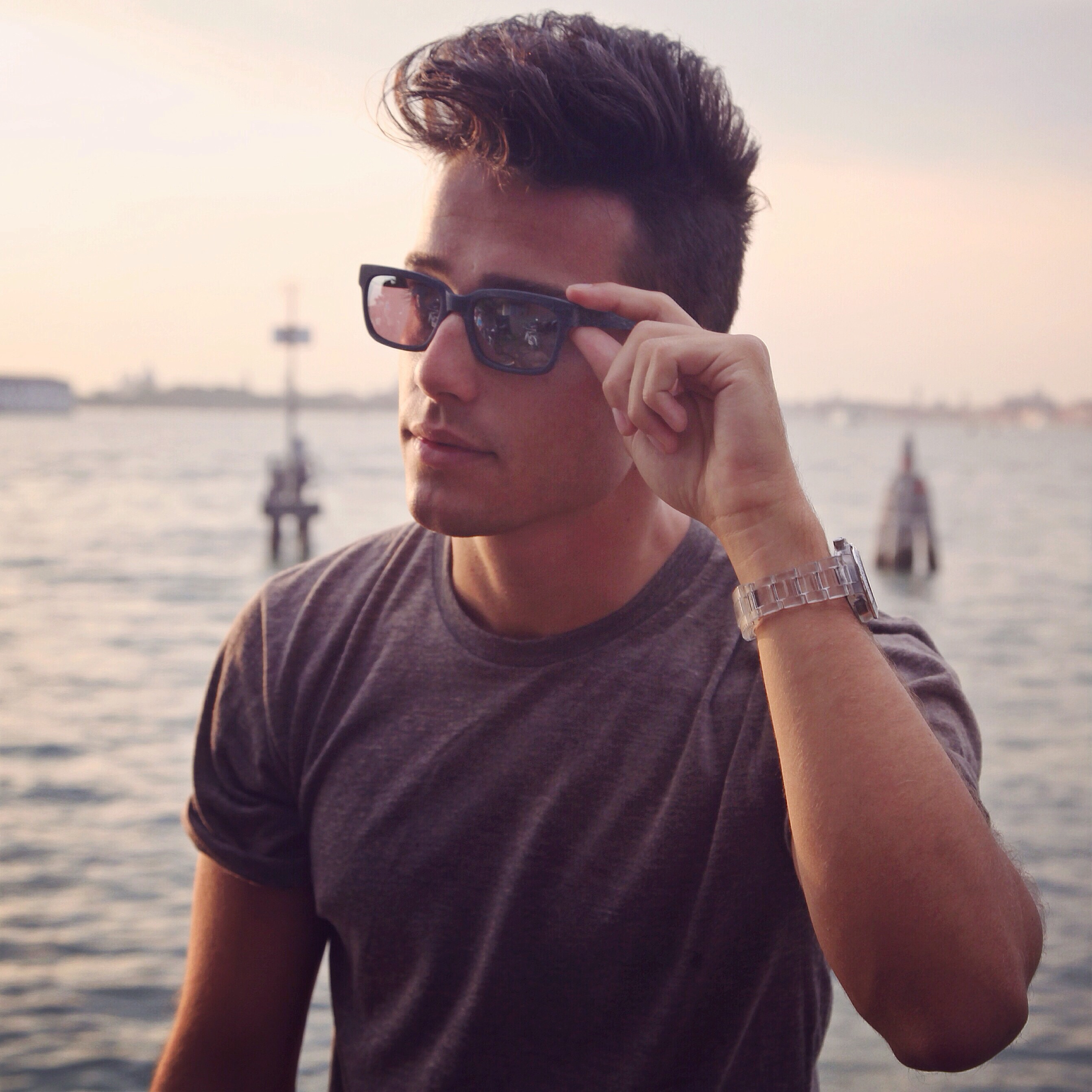 Di questa prima collezione, sia per uomo che donna, lanciata per la Primavera/Estate 2014, ho scelto di indossare il modello “Imposing”, che mi ha subito colpito per la particolarità ed eleganza dovuta all’effetto “legno” del materiale utilizzato per la montatura, insieme al contrasto dei colori blu e grigio delle lenti specchiate.