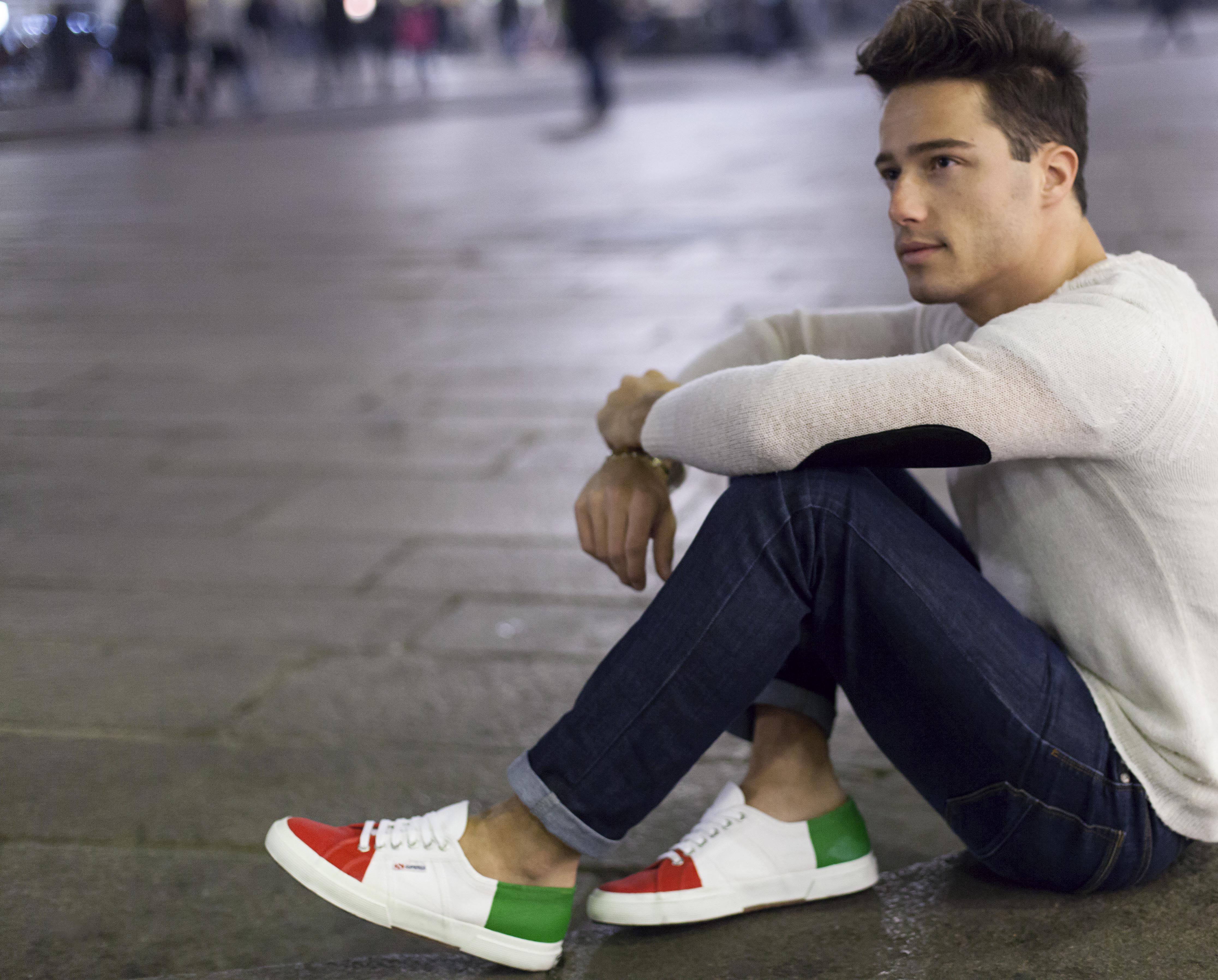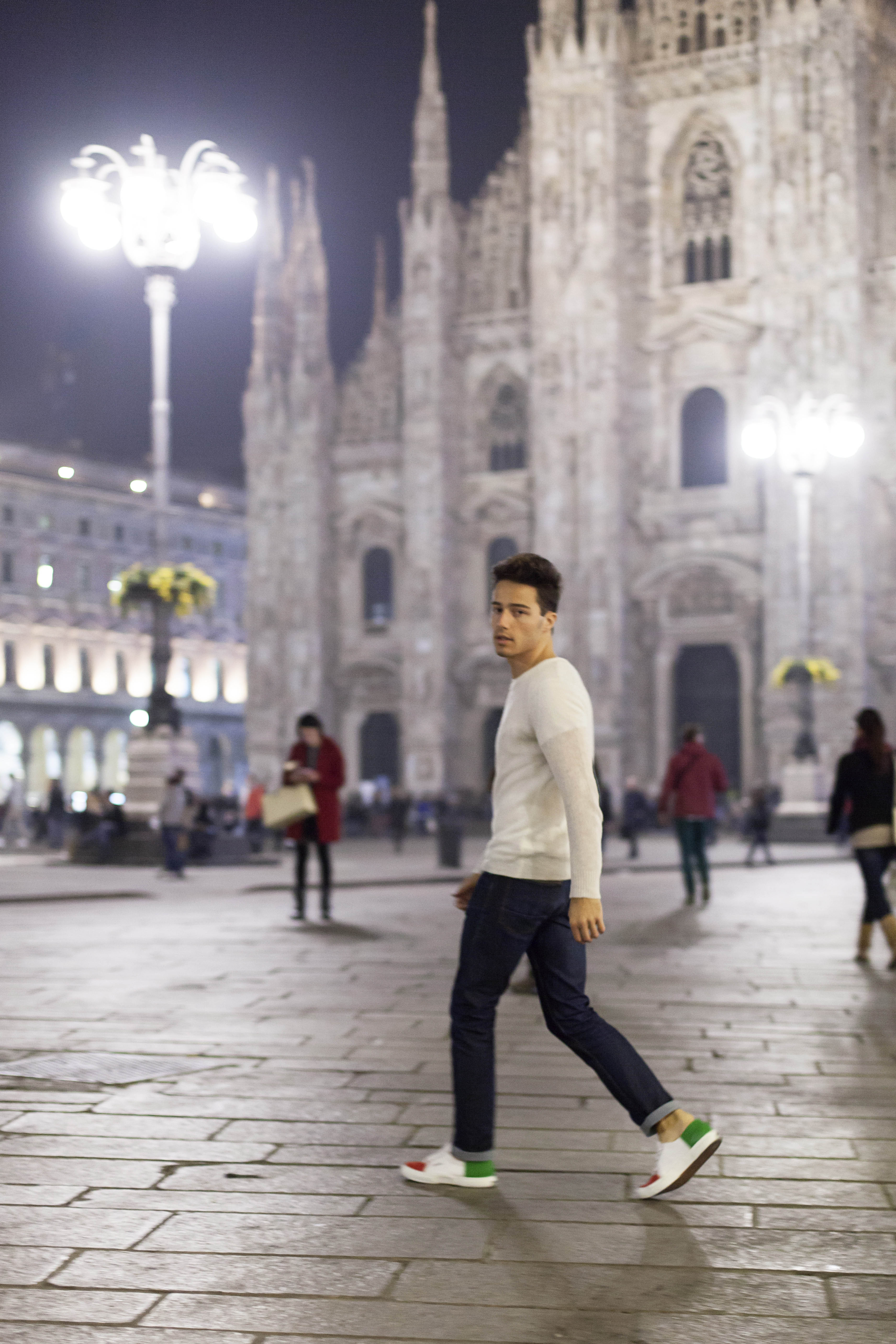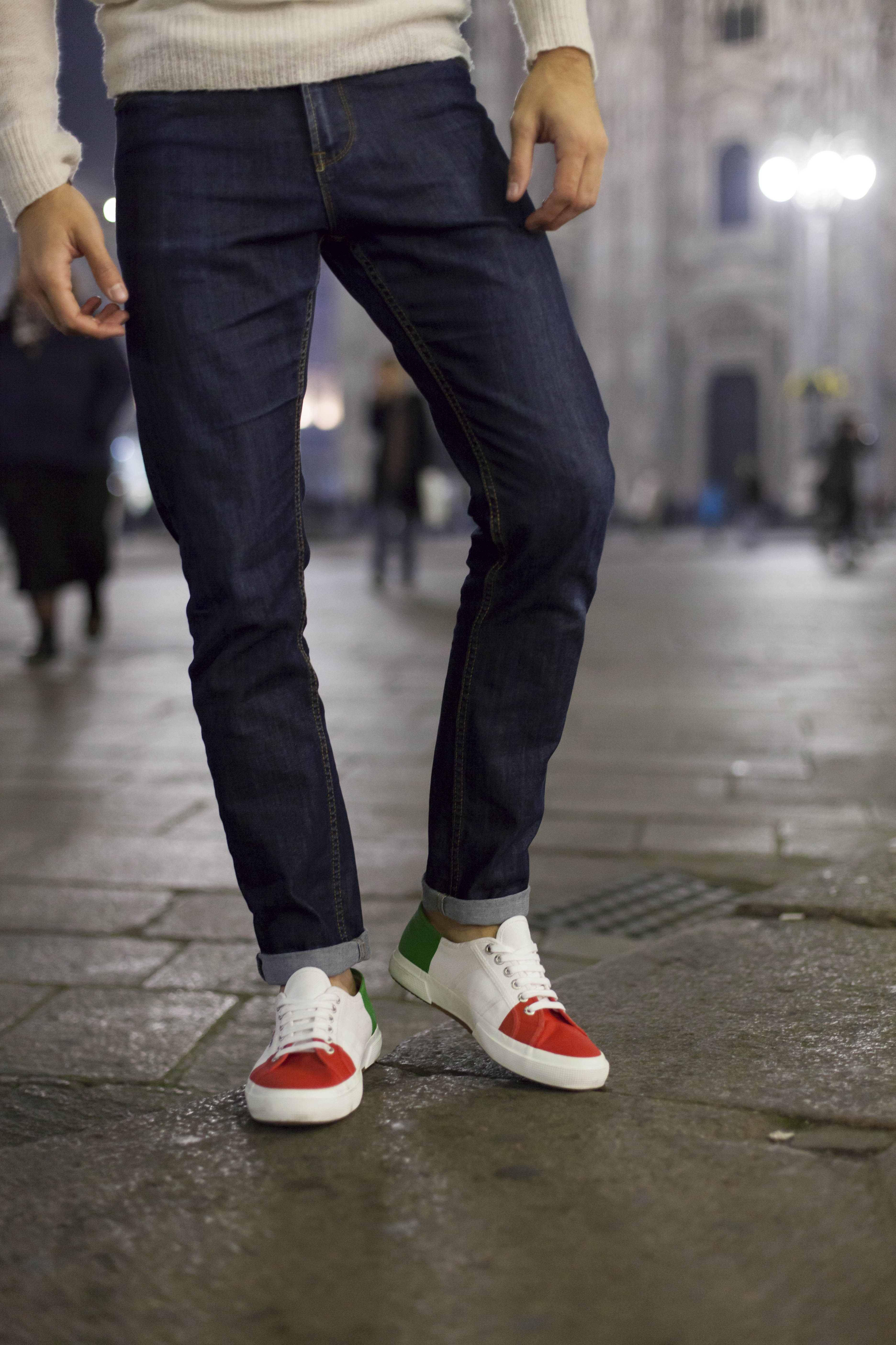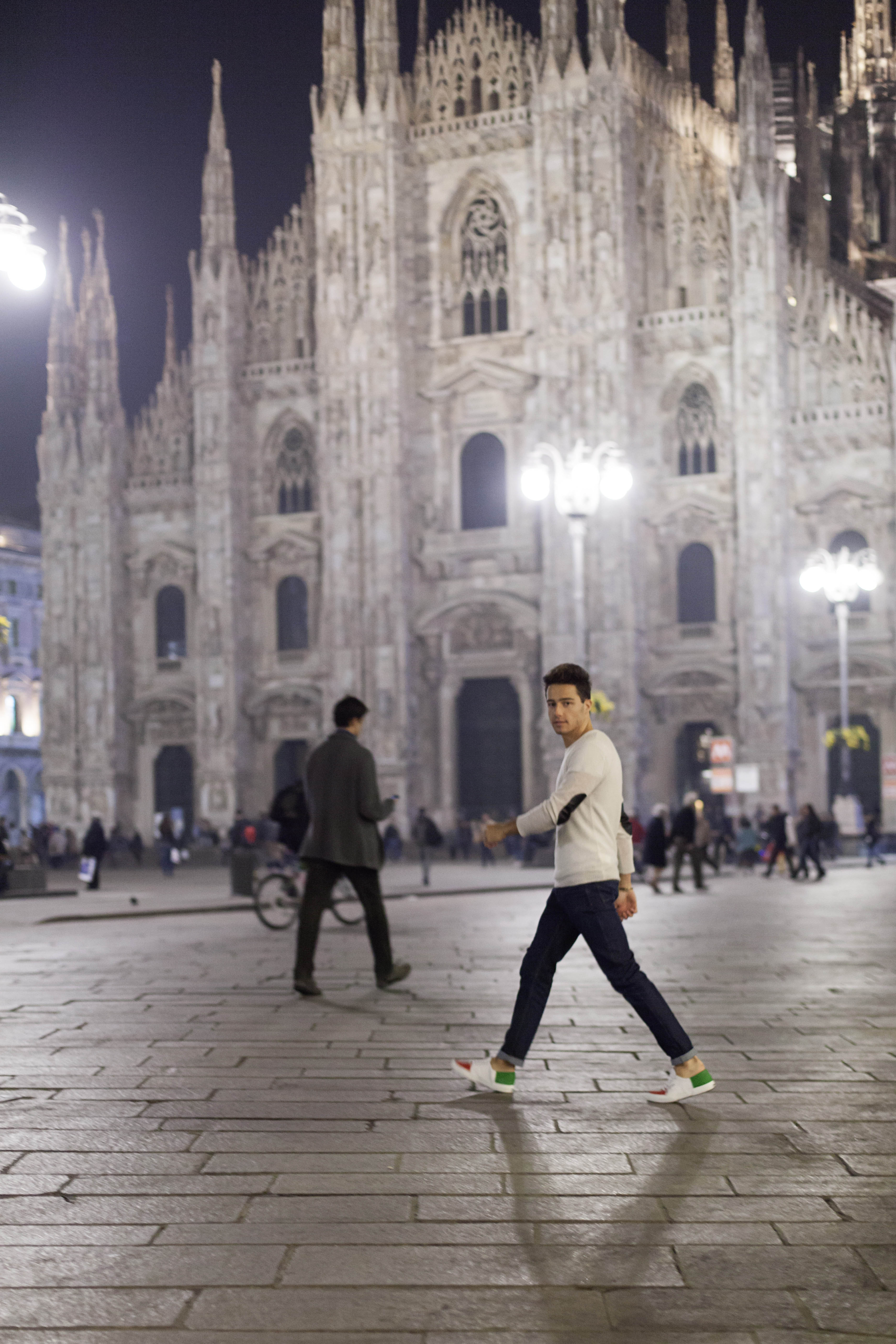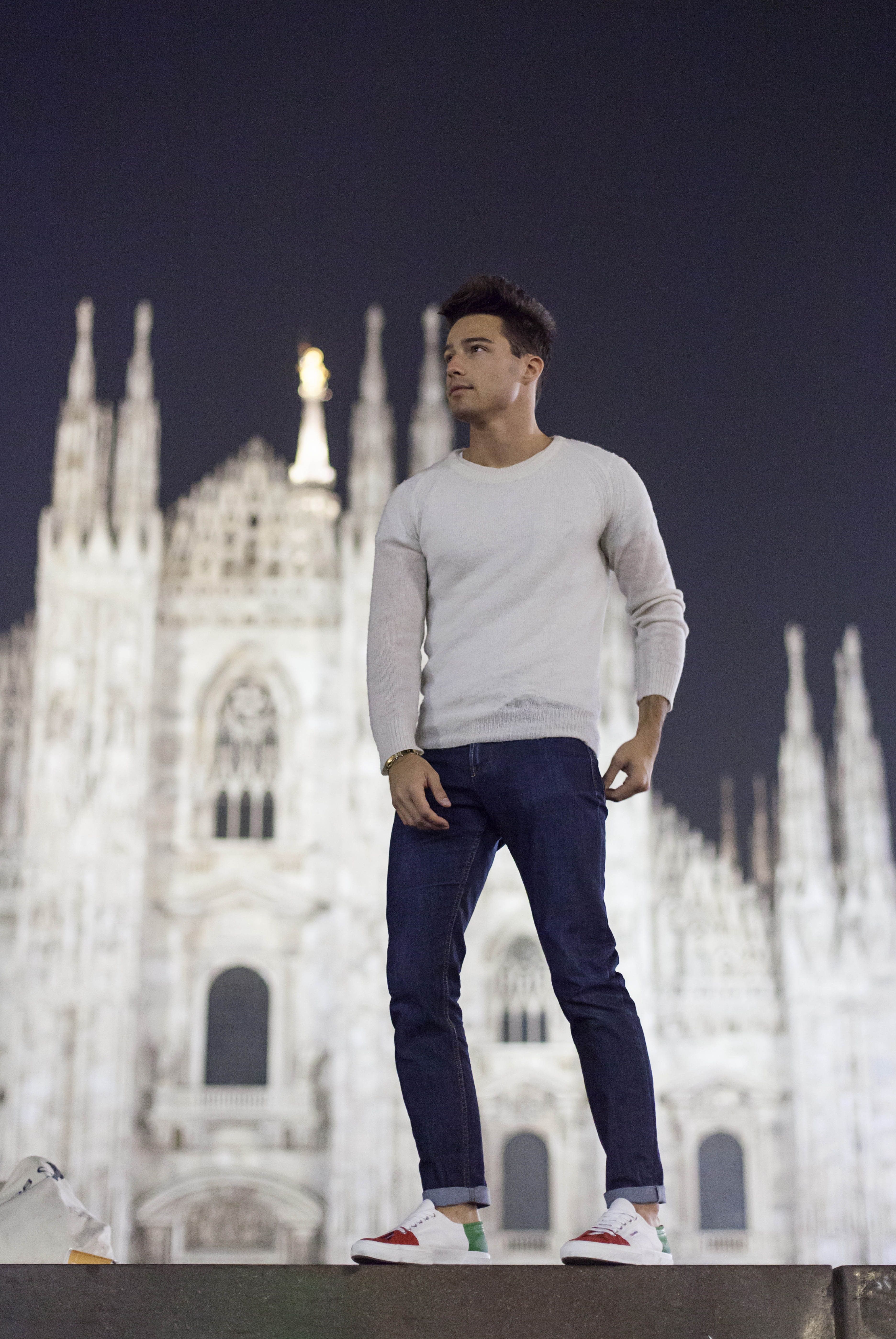 Nonostante il periodo dei Mondiali sia ormai passato da qualche mese, io ho scelto di tenere ancora alto lo spirito patriottico indossando il modello con la bandiera italiana!! … e quale location-simbolo più adatta se non la Piazza del Duomo di Milano??