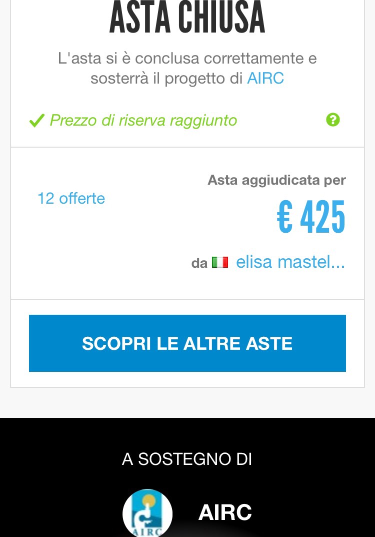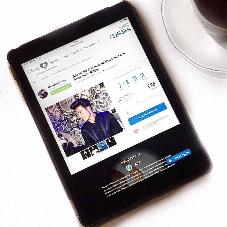 Si tratta di un‘asta benefica in cui il vincitore parteciperà al mio fianco, in prima fila, alla sfilata Richmond Blacklabel ed il ricavato sarà devoluto a sostegno di AIRC (Associazione Italiana Ricerca sul Cancro – Insieme Contro i Tumori Pediatrici).